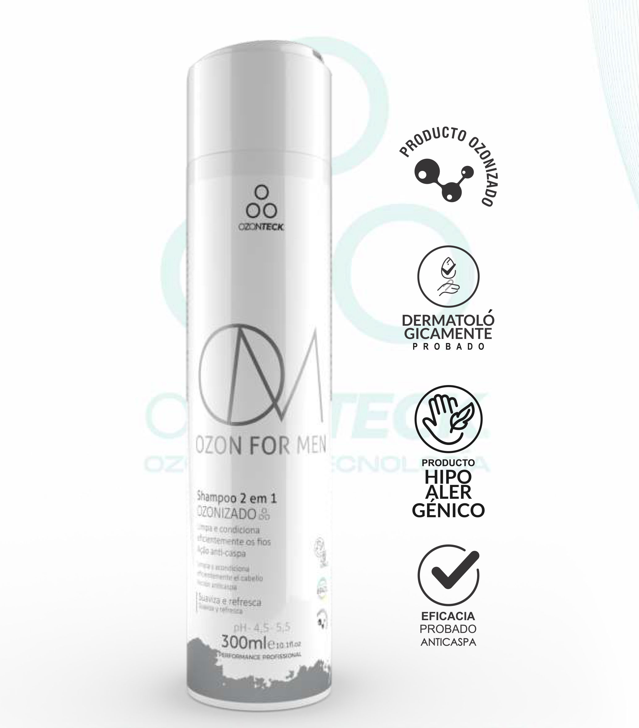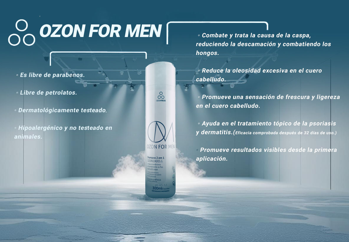 Ozon for Men Ozone está especialmente indicado para el tratamiento de la caspa, control de la grasa y limpieza equilibrada del cabello y cuero cabelludo, acciones intensificadas por la presencia de ozono en su formulación exclusiva. Se puede utilizar a diario y tiene acción acondicionadora, prescindiendo del uso de acondicionadores en caso de cabello corto y sano.