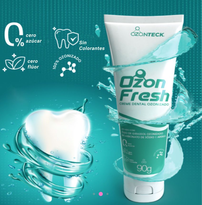 ¡Dientes más blancos, brillantes y saludables! La pasta de dientes ozonizada Ozonteck Ozon Fresh tiene una formulación eficaz sin colorante, sin azúcar, sin flúor y totalmente fresca que ayuda a combatir el amarilleo de los dientes.
